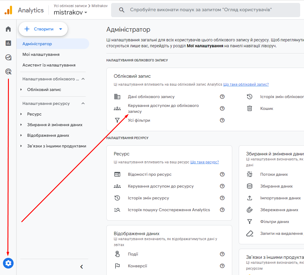 Крок 1. Зайдіть в Google Analytics і оберіть пункт “Адміністратор” (шестерня) в лівому меню, оберіть потрібний акаунт та клацніть на пункт “Керування доступом до акаунту” під ним.