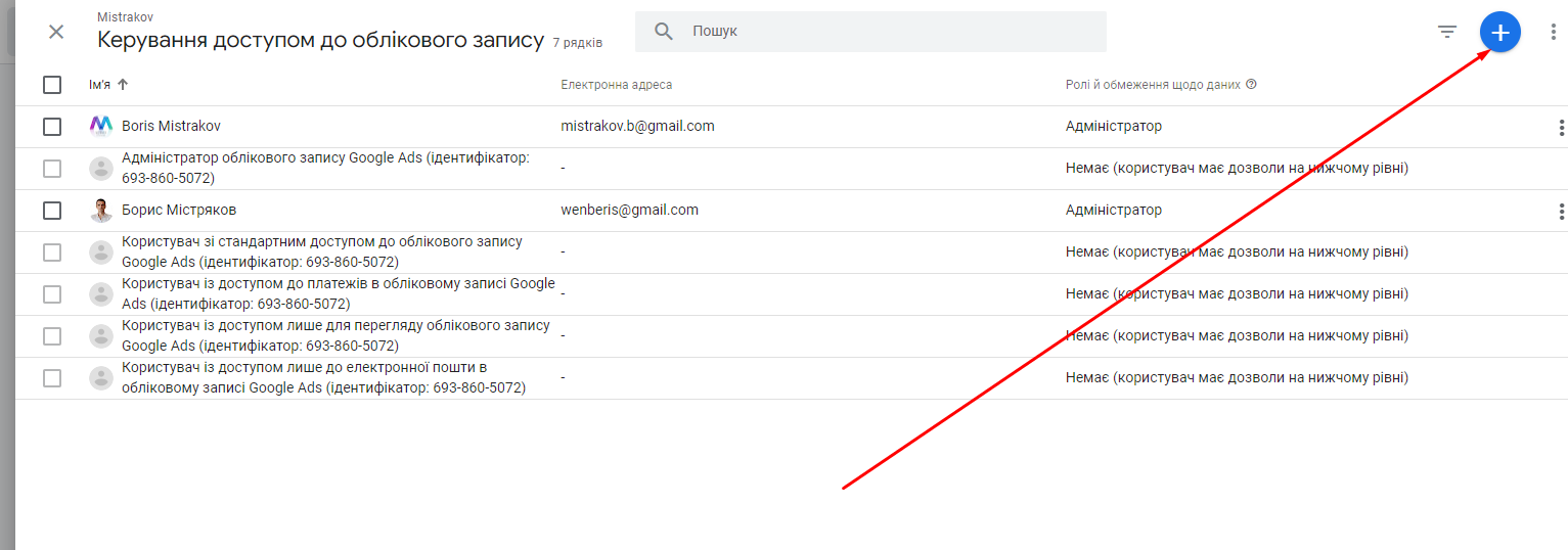 Якщо при переході в “Управління доступом до облікового запису” ви не бачите піктограми із “+”, значить у вашого акаунту немає дозволів на те, щоб додавати нових користувачів. В такому випадку слід звернутись по допомогу до колег, які також мають доступ до аналітики.