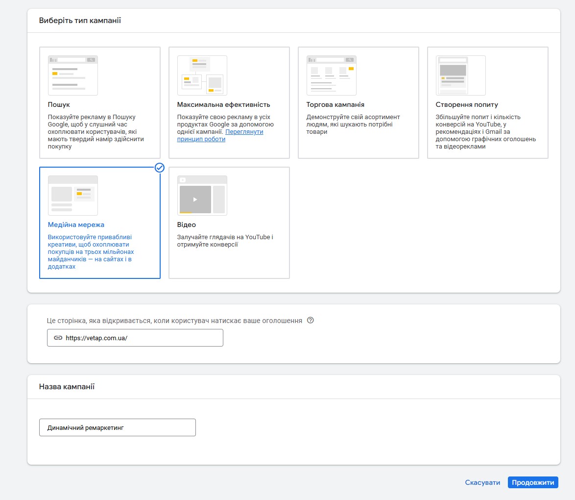 На наступному етапі налаштувань оберіть тип кампанії “Медійна мережа”. Цей формат забезпечує показ ваших оголошень на вебсайтах, які є партнерами Google. Далі, активуйте опцію для динамічної реклами, щоб пов’язати кампанію з фідом продуктів чи послуг.