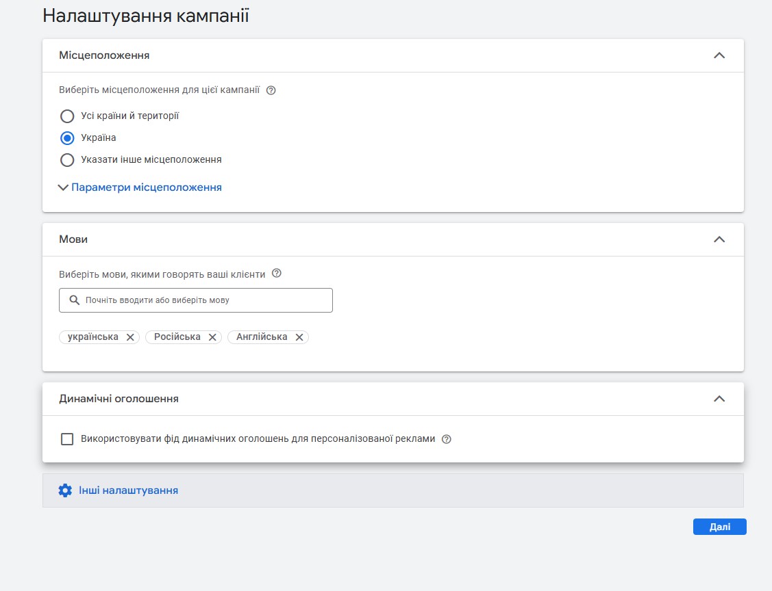 Вкажіть географічне охоплення та мови, якими розмовляє ваша цільова аудиторія. Задайте тривалість кампанії, щоб оголошення показувалися у потрібний період. У налаштуваннях також встановіть пристрої, на яких будуть відображатися оголошення.