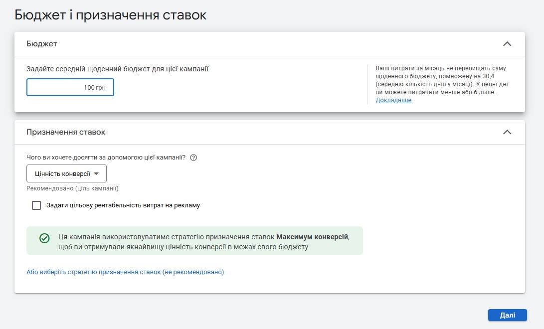 Задайте щоденний бюджет для вашої кампанії, враховуючи розмір аудиторії та очікувану кількість конверсій. Оберіть стратегію ставок, наприклад, “Максимальна кількість конверсій” або “Цільовий ROAS”, щоб оптимізувати ефективність витрат.