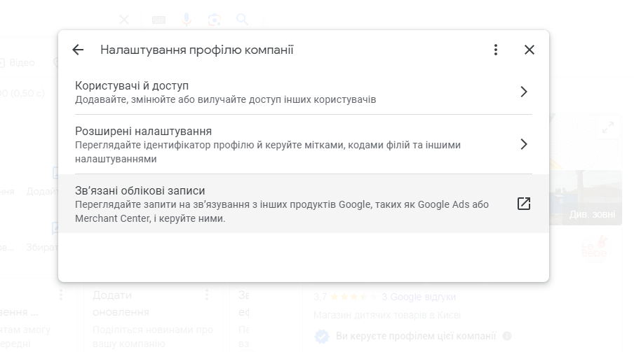 Вибираємо налаштування профілю кампанії (або одразу з пошуку в профілі вашої компанії)